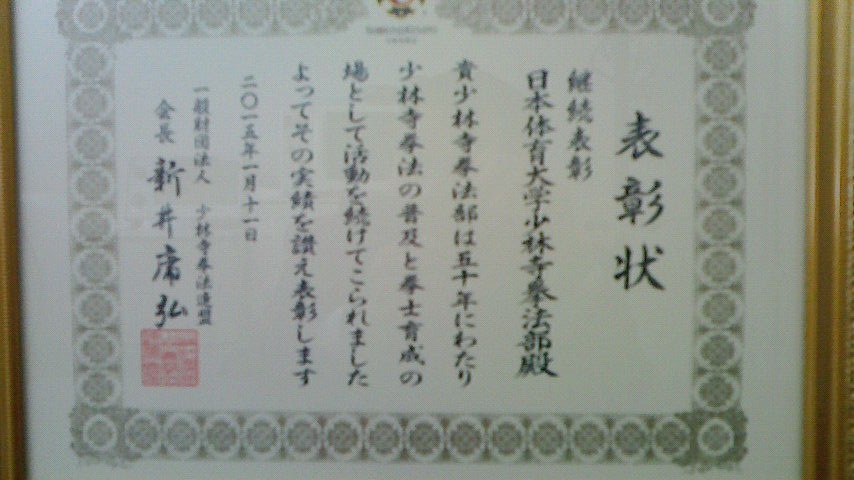 その前日の1月10日(土)勤続・継続表彰が行われ、日本体育大学学友会少林寺拳法部が勤続50周年の表彰を受けました