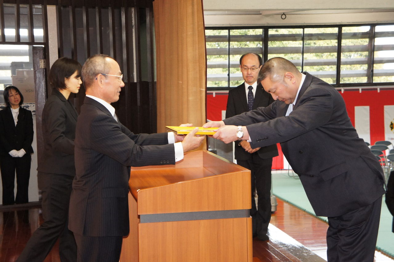 新井庸弘会長から勝田真也監督へ表彰状が手渡されました