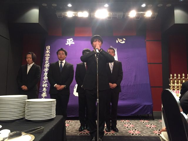 まずはこの昨年4月より部長に就任して頂きました斎藤雅英先生よりご挨拶を頂きました。「各先生方の祝辞をしっかりと受け止めてその言葉の重みを感じてほしい!」とのお言葉をいただきました!これからも少林寺拳法部を何卒よろしくお願いいたします!